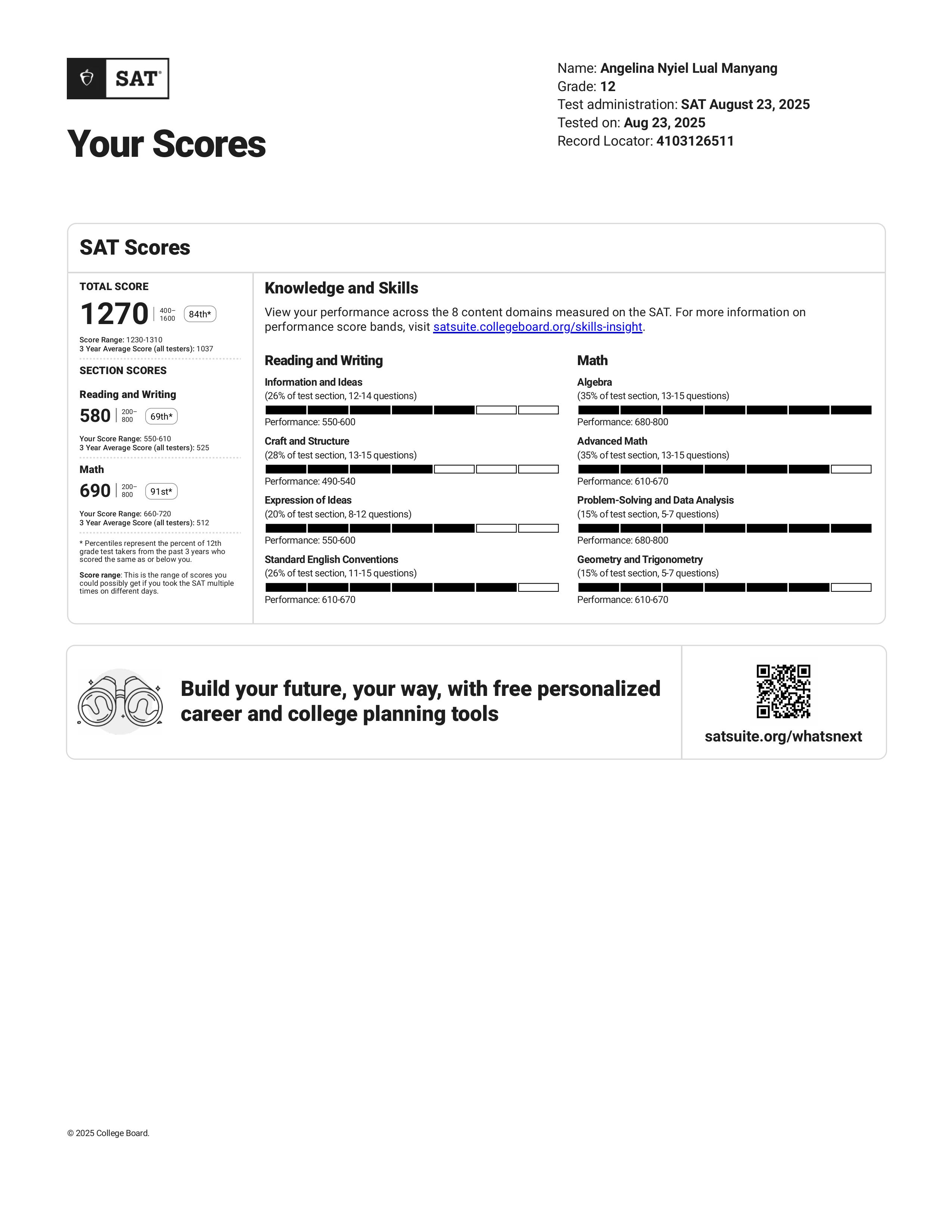Life has not been easy. I spent some of my high school years in a refugee camp, where resources were limited, and opportunities for learning were scarce. Despite these challenges, I worked tirelessly to catch up with my studies. In 2023, I was awarded a scholarship to attend St. Julian High School, where I completed my Senior Four education. Today, I am continuing my A-level studies at the African Science Academy in Ghana, surrounded by brilliant peers from across Africa, but the path to college abroad requires one more step: the SAT exams.